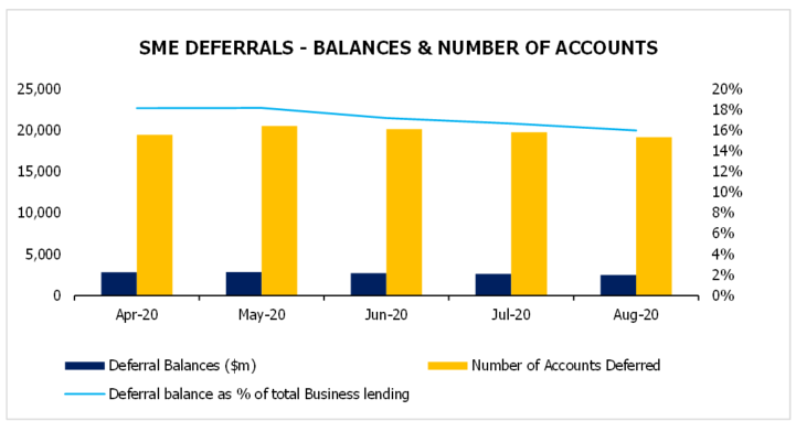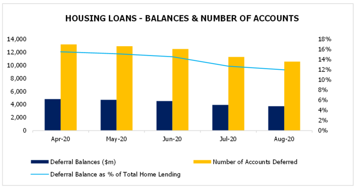 2 Number of deferred accounts and balances compared to gross loans and advances. Note this calculation varies to the APRA July 2020 loan repayment data statistics due to differences in definition.