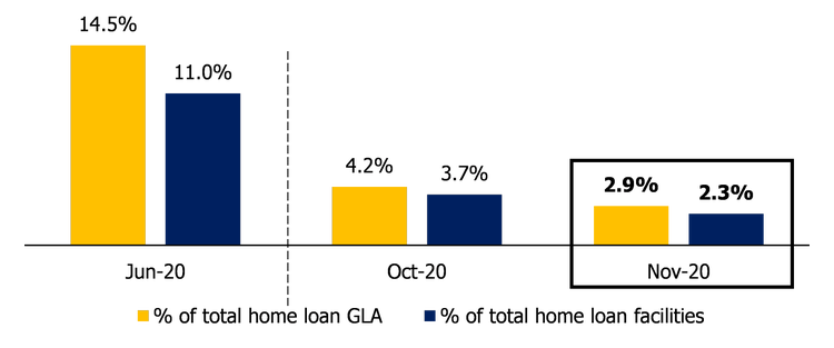 As at 30 November 2020 BOQ has 2,500 housing loans remaining in deferral with balances of $889m. These balances represent 3% of BOQ’s housing loan portfolio. BOQ has 3,300 SME loans remaining on deferral with balances of $390m as at 30 November 2020. These balances also represent 3% of BOQ’s total SME lending.
